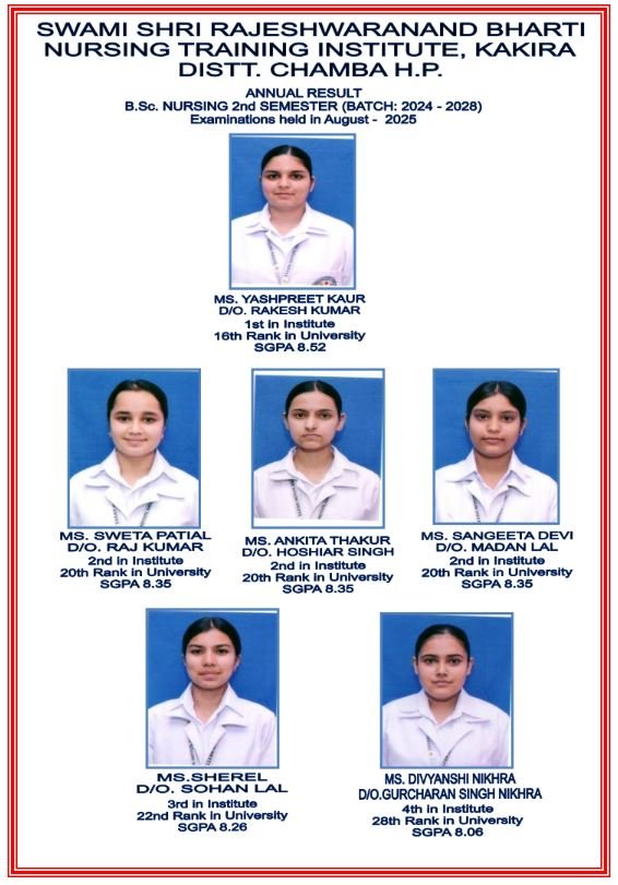 TOTAL NUMBER OF 35 STUDENTS APPEARED FOR B.Sc NURSING 2ND SEMESTER EXAMINATION IN THE MONTH OF AUGUST 2024 AND BY THE GRACE OF SWAMI JI ALL STUDENTS PASSED THE EXAMINATION AND ACHIEVED GOOD GRADES.